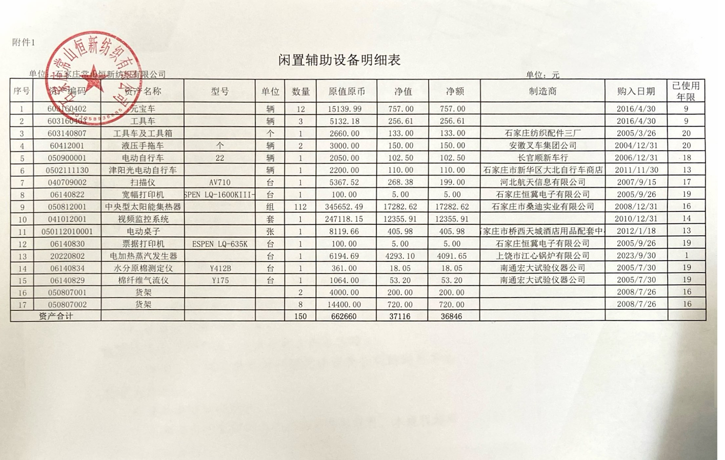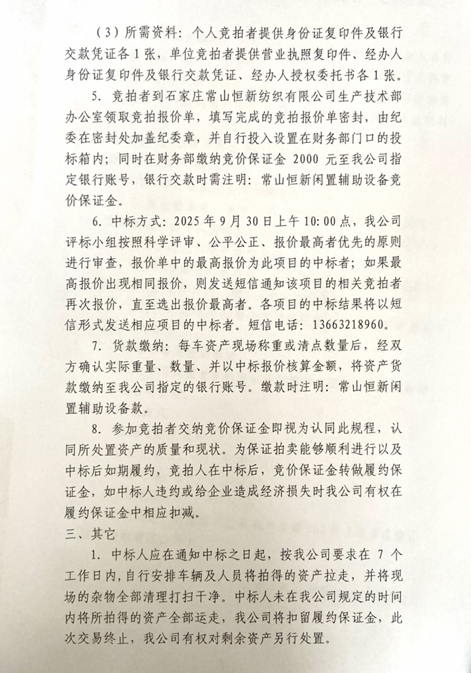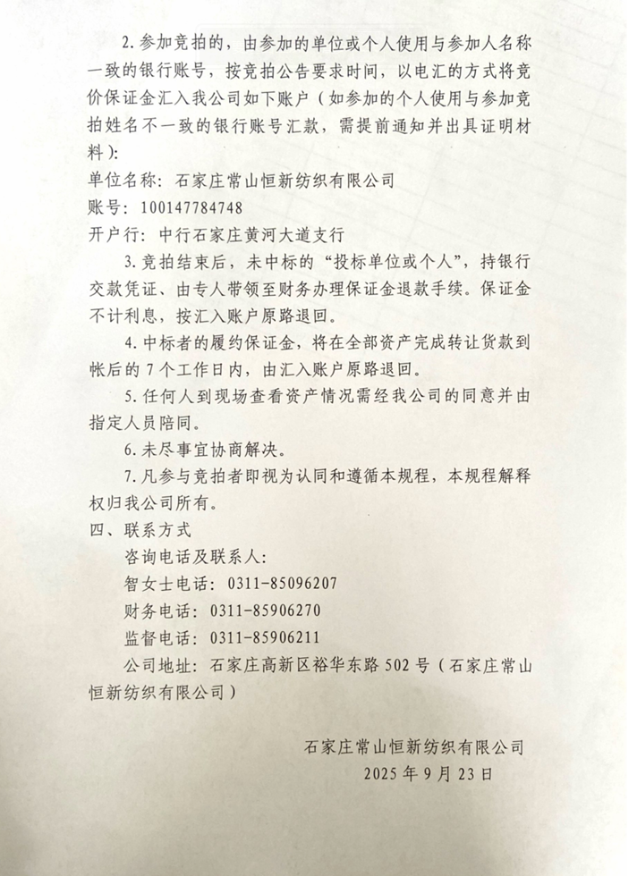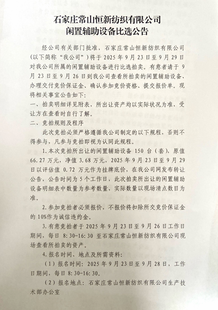 石家莊常山恒新紡織有限公司閑置輔助設(shè)備比選公告