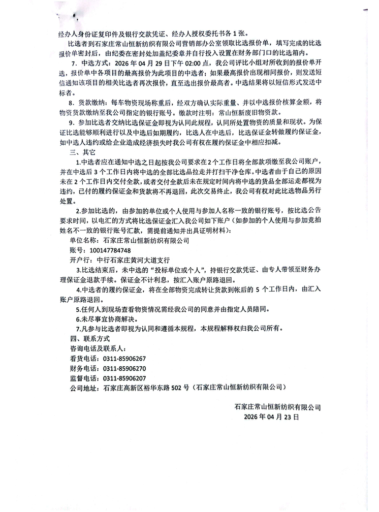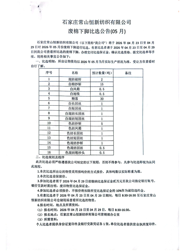 石家莊常山恒新紡織有限公司 廢棉下腳比選公告(05)月