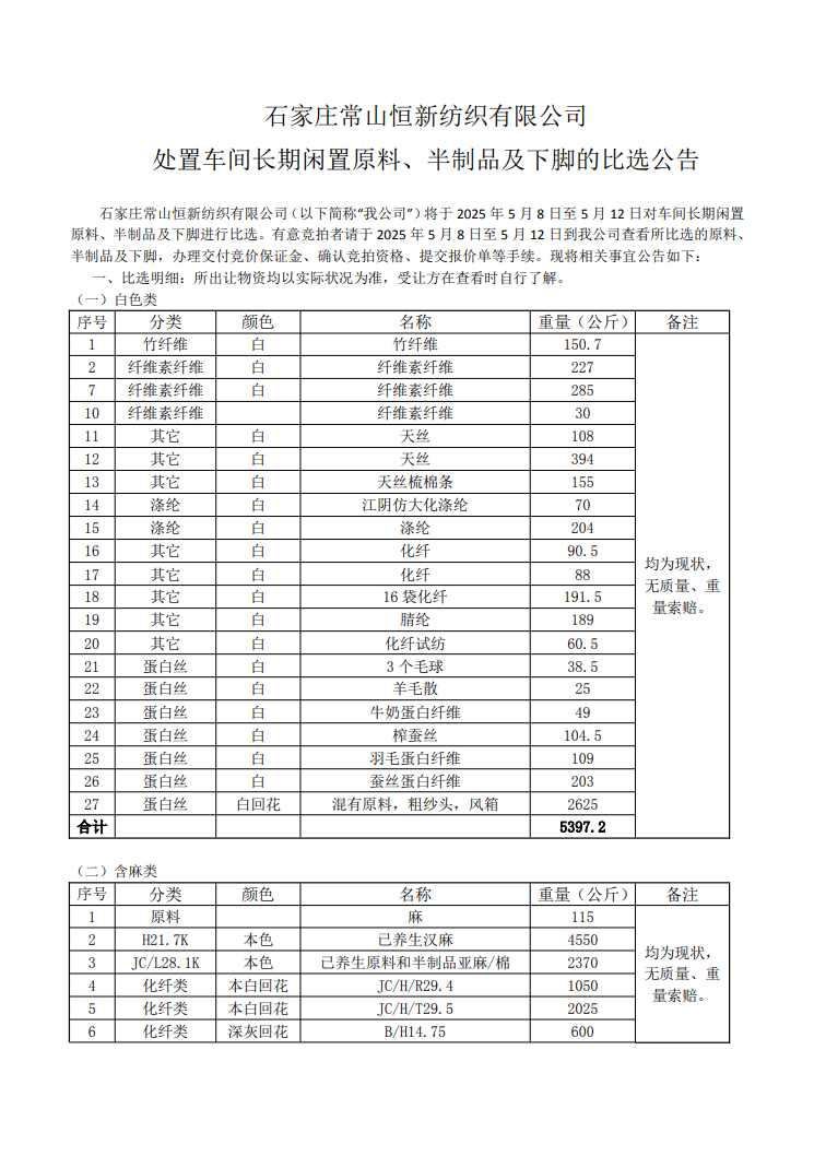 石家莊常山恒新紡織有限公司 處置車間長期閑置原料、半制品及下腳的比選公告